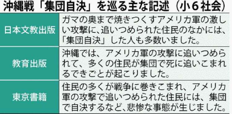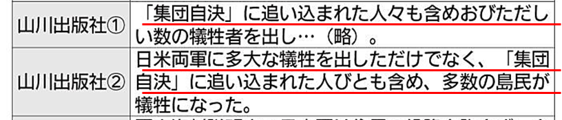 2冊が検定を通った山川は、そのうちの1冊で「『集団自決』に追い込まれた人々も含めおびただしい数の犠牲者を出し…」と記した。もう1冊では「日米両軍に多大な犠牲を出しただけでなく、『集団自決』に追い込まれた人々も含め、多数の島民が犠牲になった」と記述。どちらも日本軍の関与に触れていない。