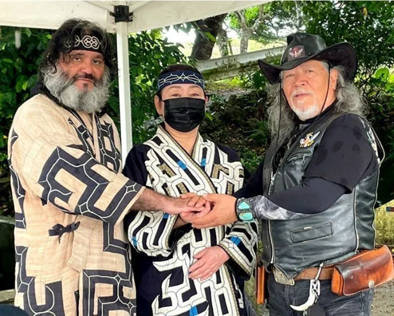 寿明さんと母の美優亀さん(62)は真栄平住民とアイヌ民族の交流が続くことを願う。そこで昨年5月に親戚の阿寒アイヌ工芸協同組合専務理事の秋辺日出男さんを南北之塔に招いて真栄平の住民と交流した。今年6月の慰霊の日の前の清掃活動にも秋辺さんを招く予定だ。