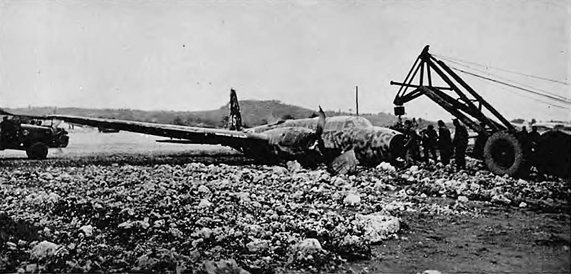 【訳】ミッション終了。これは、5月下旬のある夜、自爆テロ弾が当時沖縄で最も重要だった飛行場を破壊しようとしたとき、読谷飛行場に着陸しようとして胴体着陸した日本の双発機「サリー」である。これが唯一着陸できた機体だった。他の全ての機体は飛行場近くで撃墜された。ここでは、第87工兵隊のドーザーが牽引する「チェリーピッカー」が、その迷彩色飛行機を滑走路からひきずりだしているところ。