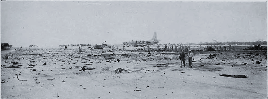 着陸前に空中で爆破された別の自爆機の残骸が、この旧日本軍飛行場一帯に散らばっている。空挺破壊工作員を満載した敵機は胴体着陸しようとしていたところ、高射砲の射程に入り、真正面から飛行機の残骸とその乗員の遺体を広範囲に散らばらせた。ここでは、ブルドーザーとモーターグレーダーが重い瓦礫の撤去を開始した。たくさんの C-54 輸送機が破壊された。